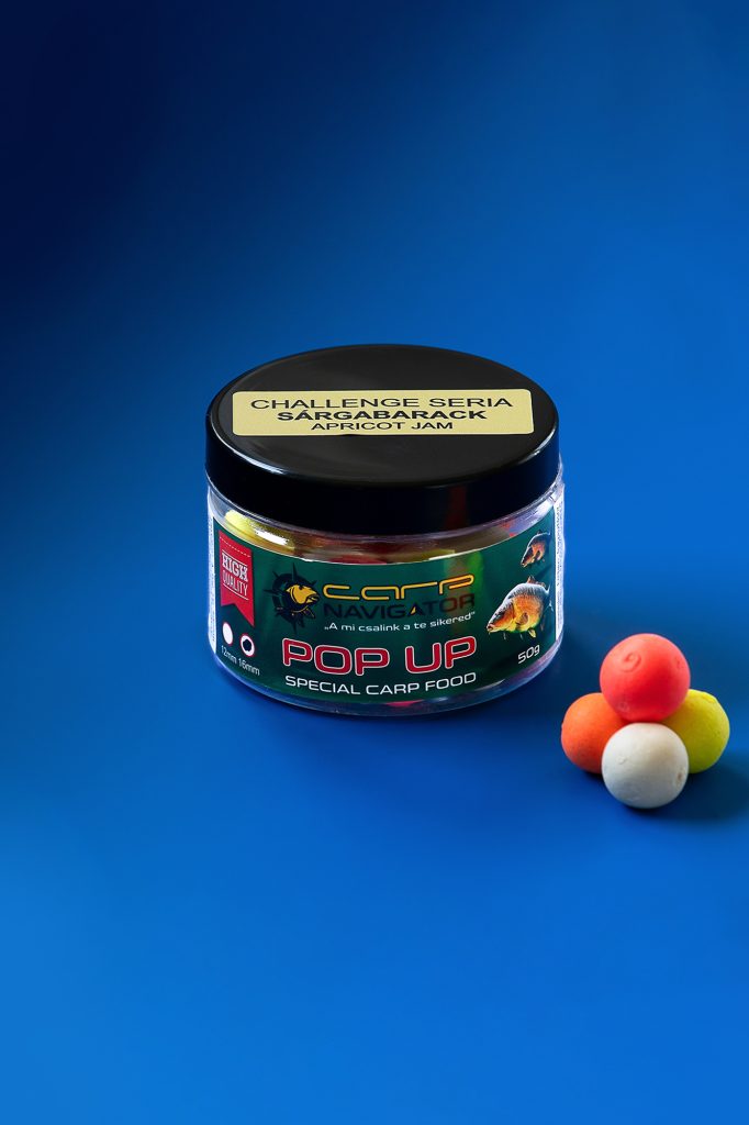 Az Apricot Jam Pop-Up 4 féle színű (fehér, citromsárga, narancssárga,piros) magas minőségű, anyagában nagy mennyiségű aminót és étvágyfokozót tartalmazó lebegő csali. Csomagolás előtt még egyszer átesnek egy aroma és étvágyfokozó fürdőn, ez által még ellenállhatatlanabbá téve a halak számára. Anyagösszetétele lehetővé teszi a későbbi dippelést. A palettán található, hozzá tartozó dippekkel felfrissíthetjük, vagy még intenzívebbé tehetjük. Kiemelkedő felhajtó ereje, enyhén gumis állaga miatt akár több napon át is lebeg, ellenáll az apró halak és törpeharcsa támadások ellen.