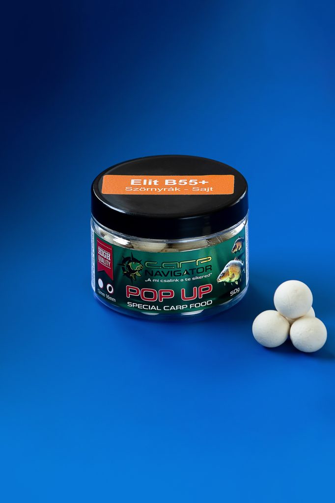 Az ElitB55Pop-Up magas minőségű, fehér színű, anyagában nagy mennyiségű aminót és étvágyfokozót tartalmazó lebegő csali. Csomagolás előtt még egyszer átesnek egy aroma és étvágyfokozó fürdőn, ez által még ellenállhatatlanabbá téve a halak számára. Anyagösszetétele lehetővé teszi a későbbi dippelést. A palettán található, hozzá tartozó dippekkel felfrissíthetjük, vagy még intenzívebbé tehetjük. Kiemelkedő felhajtó ereje, enyhén gumis állaga miatt akár több napon át is lebeg, ellenáll az apró halak és törpeharcsa támadások ellen.